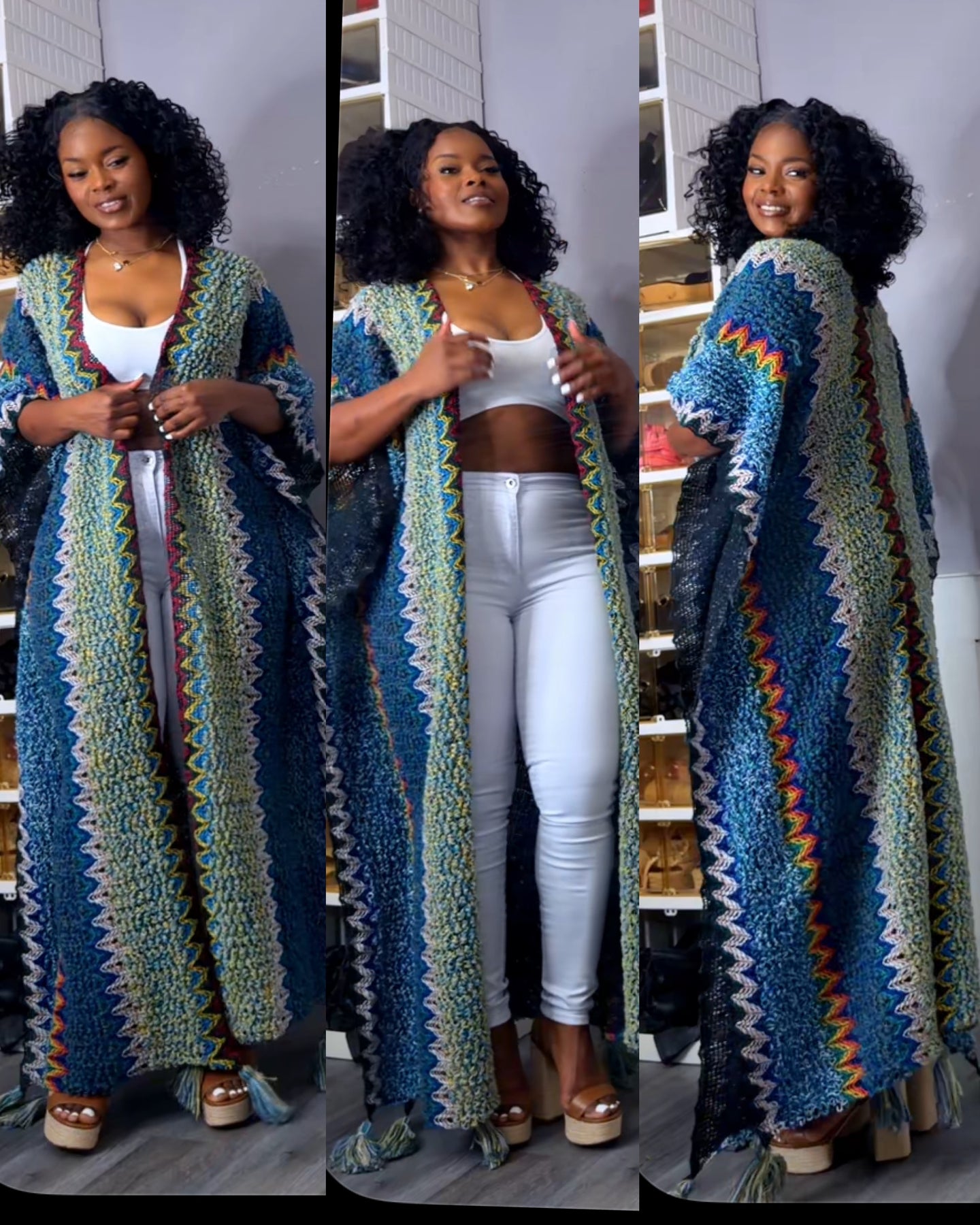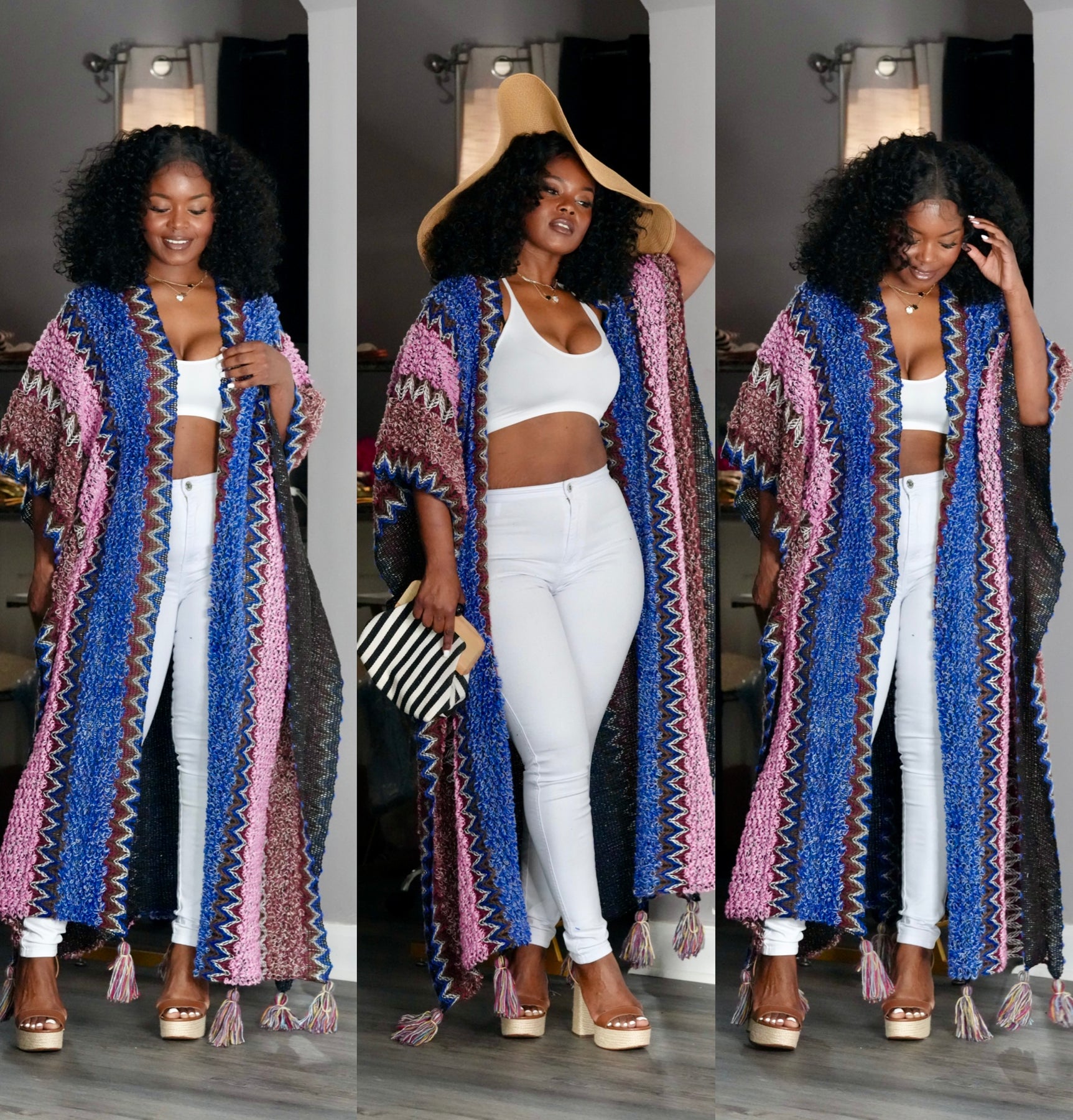 Turn heads without even trying in our Boho Luxe Tassel Duster Kimono. This statement piece blends effortless bohemian vibes with chic everyday style. Featuring a bold zig-zag woven pattern in rich tones of blue, pink, and mocha, this lightweight duster flows beautifully with every step.
